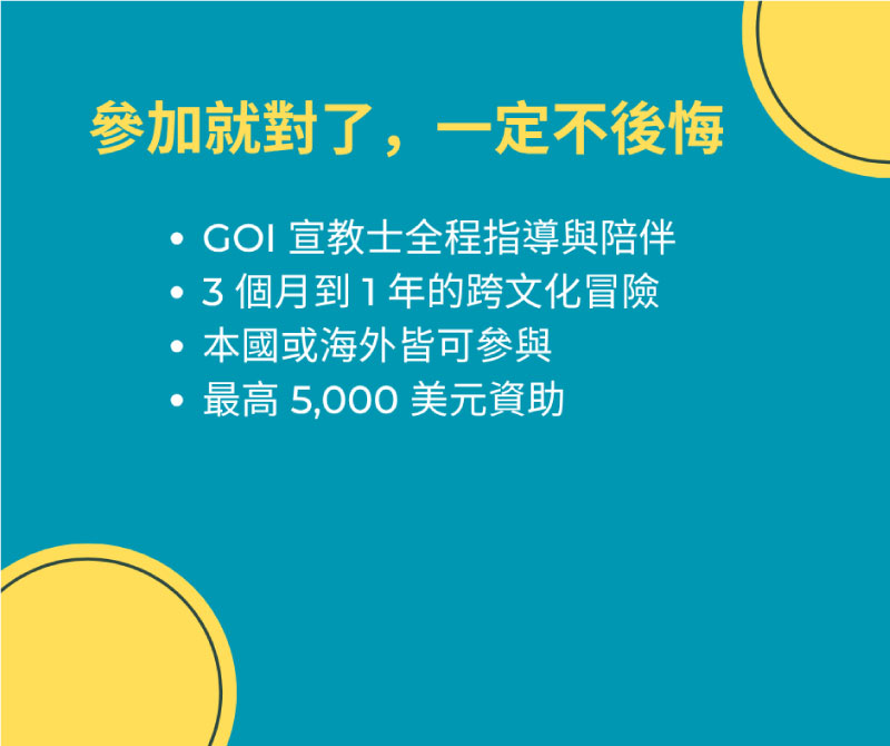 這是一個由華傳(GOI)發起的跨文化宣教計畫,邀請 18–35 歲的基督徒,透過 3 個月到 1 年的實地參與,認識不同文化並分享福音。