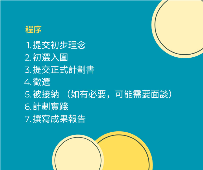 提交初步理念 → 提交正式計劃書→徵選 →被接納 (如有必要,可能需要面談)→計劃實踐 → 撰寫成果報告